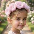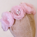 A dramatic flower crown for girls. Each petal of each flower is entirely hand cut from soft pink sparkling organza. They are layered to create large statement flowers which cover the entire headband. In the center of each flower are hand stitched cut and crystal pearl beads and glittering diamantes of the highest quality. This bespoke kids headpiece piece is perfect for weddings or childrens special occasions. Comes in a chiffon pouch for safe keeping.