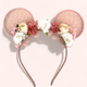 The Daisie Luxury Girls mouse ears are so cute. Firstly a cluster of hand made and hand painted flowers in shades of dusky pink sit in front of the mouse ears. Then the pink mouse ears are covered with a gorgeous lace tulle. The ears and then edged with dozens of handmade mini daisies in pink. The headband is covered in ivory satin. The cutest luxury kids' headband that will be the show stopper at any party.