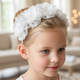 This girl's headband is unique in its design, and very classic at the same time.  The soft pink satin-covered headband is handstitched with hand-threaded flowers.  Each flower has large pale pink cut crystal petals with large freshwater pearl centres.  The fresh water pearls are then surrounded by smaller circular soft pink crystals.  This is the sweetest headband that is perfect for flower girls or any special occasion.  This piece comes in its own Sienna Likes to Party Chiffon pouch, making it the perfect keepsake or heirloom gift.
