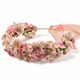 This gorgeous flower crown is handcrafted with hand-cut flowers made from layers of soft pink chiffon. The flowers are then centred with sparkling pink crystals and pearl beads to make a standout centrepiece to the flowers. In between each flower are hand-wired vines of flower buds with each branch holding a teardrop pearl bead. The garland is adjustable and covered with a soft pink satin ribbon. This style makes the perfect heirloom flower girl or a gorgeous special occasion crown.