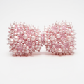 This bespoke crystal and pearl bow hair clip is completely handmade. This is a gorgeous sparkling addition to any outfit. The base of the clip is made from a pink luxury Petersham wide ribbon. Then the bow is entirely hand-stitched and embellished with different-sized pearl and lilac cut crystal beads to create the most luxurious sparkling bow. This style is a perfect keepsake gift and special occasion accessory.