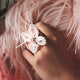 This stunning ring is completely handmade.  It is in the shape of a butterfly which is hand threaded with dozens of gorgeous pale pink cut crystal beads of different sizes.  The ring itself is silver plated and completely adjustable to fit any finger size.  This style makes a statement and makes a must-have girl's gift for all ages.