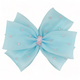 A very large statement chiffon bow headband. It consists of three bows stacked together attached with a hand-stitched white crystal center. The edge of each bow is hand-stitched with tiny white crystal beads. The bows are attached to a pink satin-covered headband. A stunning designer flower girl headband or girl's special occasion wear piece.