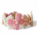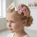 Each individual soft pastel bow is heavily detailed with hand-stitched cut crystals and different-sized pearl beads. Each bow is different, one ivory, one pale pink and one soft apricot. The handmade bows go right around the whole pink satin-covered headband creating a true stand-out and elegant childrens party hair accessory perfect for all occasions. Each piece comes in a branded Sienna Likes To party gift pouch.