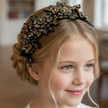 This gorgeous Hadraniel Crystal Flower designer headband is truly majestic like its name! Each flower has been handmade from beautiful embroidered black lace and embellished with a hand-stitched mix of pale gold and metallic gold cut crystals and mini pale gold pearl beads. The handcrafted flowers go right around the satin-covered headband. A fabulous hair accessory for party wear and all other special occasions. Each piece comes in a branded Sienna Likes To Party gift pouch.